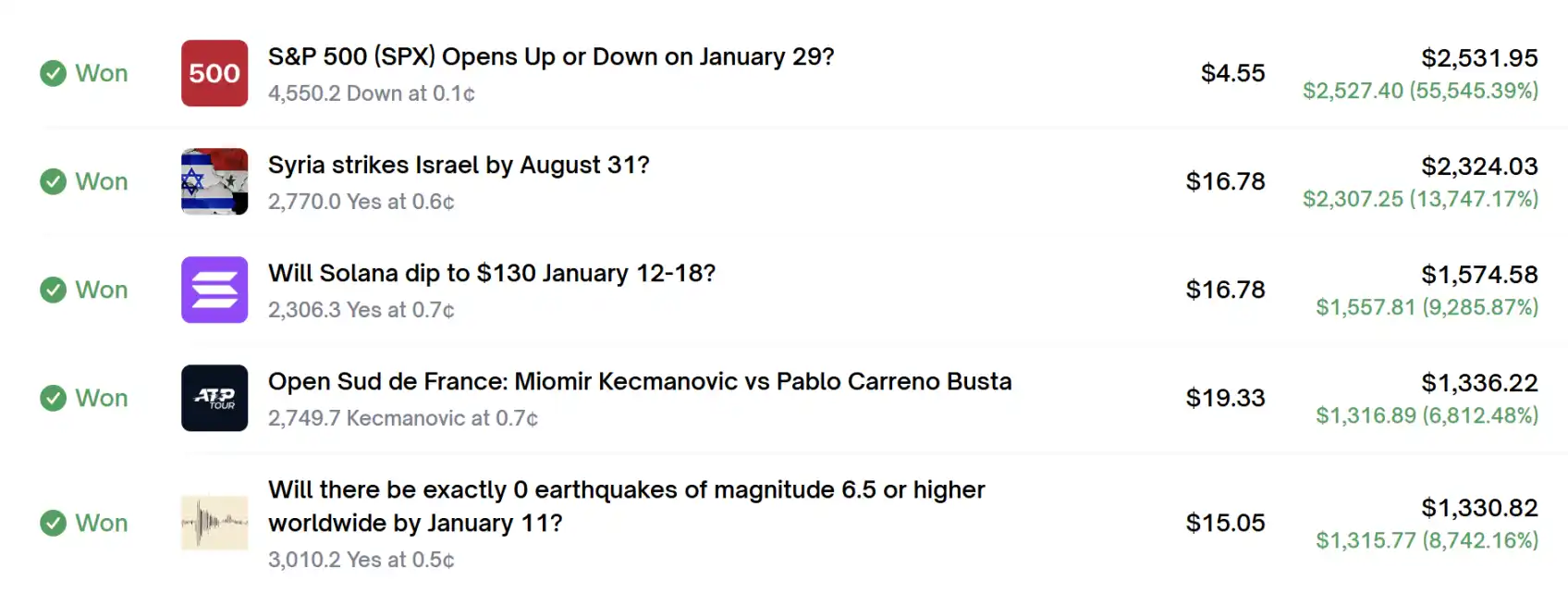 它以 0.7¢(市场认为胜率不到 1%)的价格投入约 16 美元,最终带走 1574 美元,回报率达到惊人的 9,285%。