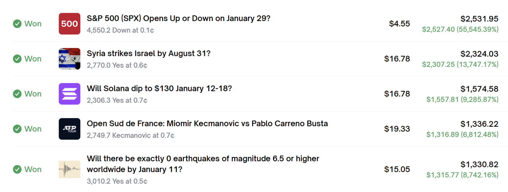 它以 0.7¢(市场认为胜率不到 1%)的价格投入约 16 美元,最终带走 1574 美元,回报率达到惊人的 9,285%。