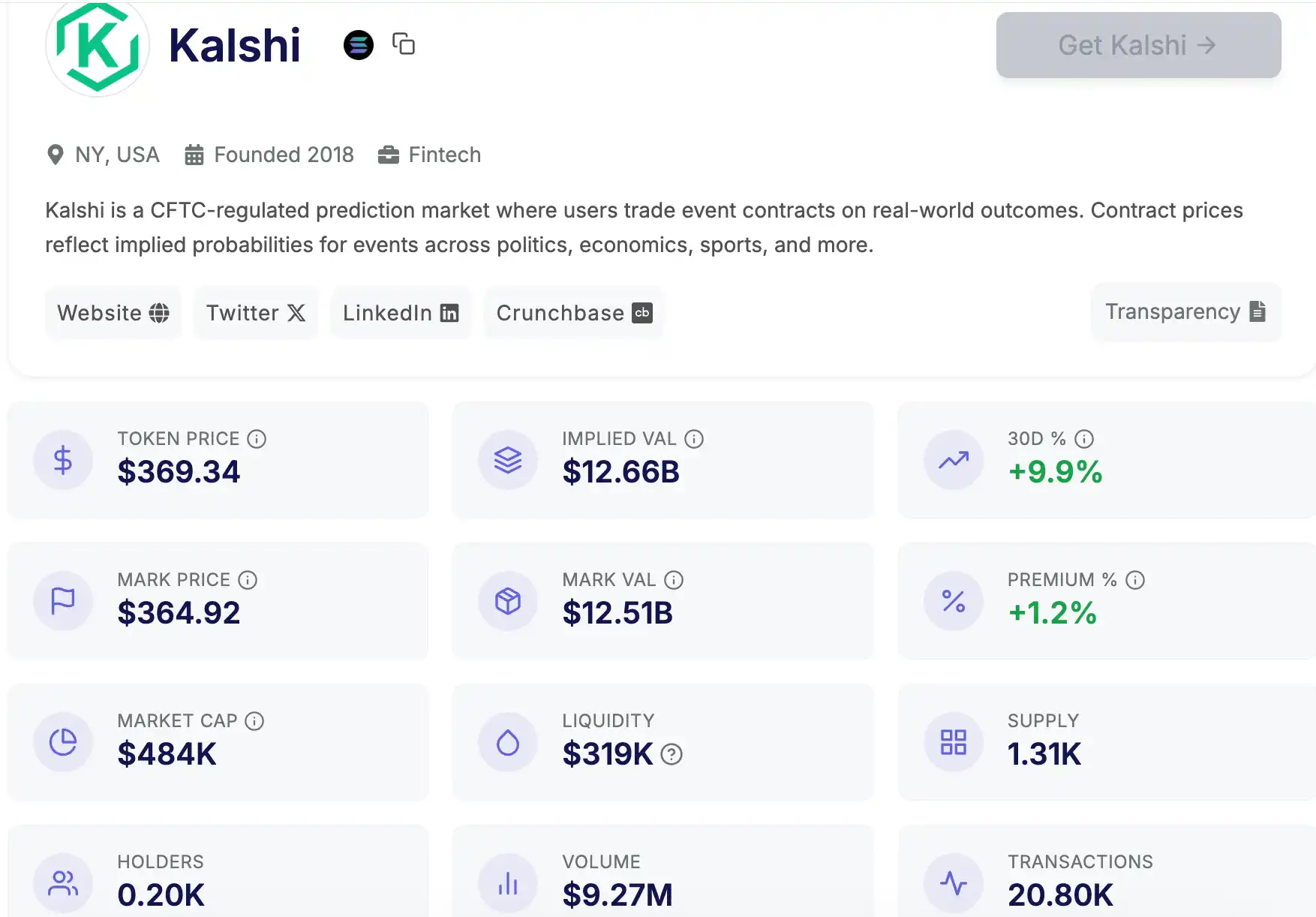 · PreStocks 上,Kalshi 隐含市值约为 140 亿美元,单股定价约为 407 美元;