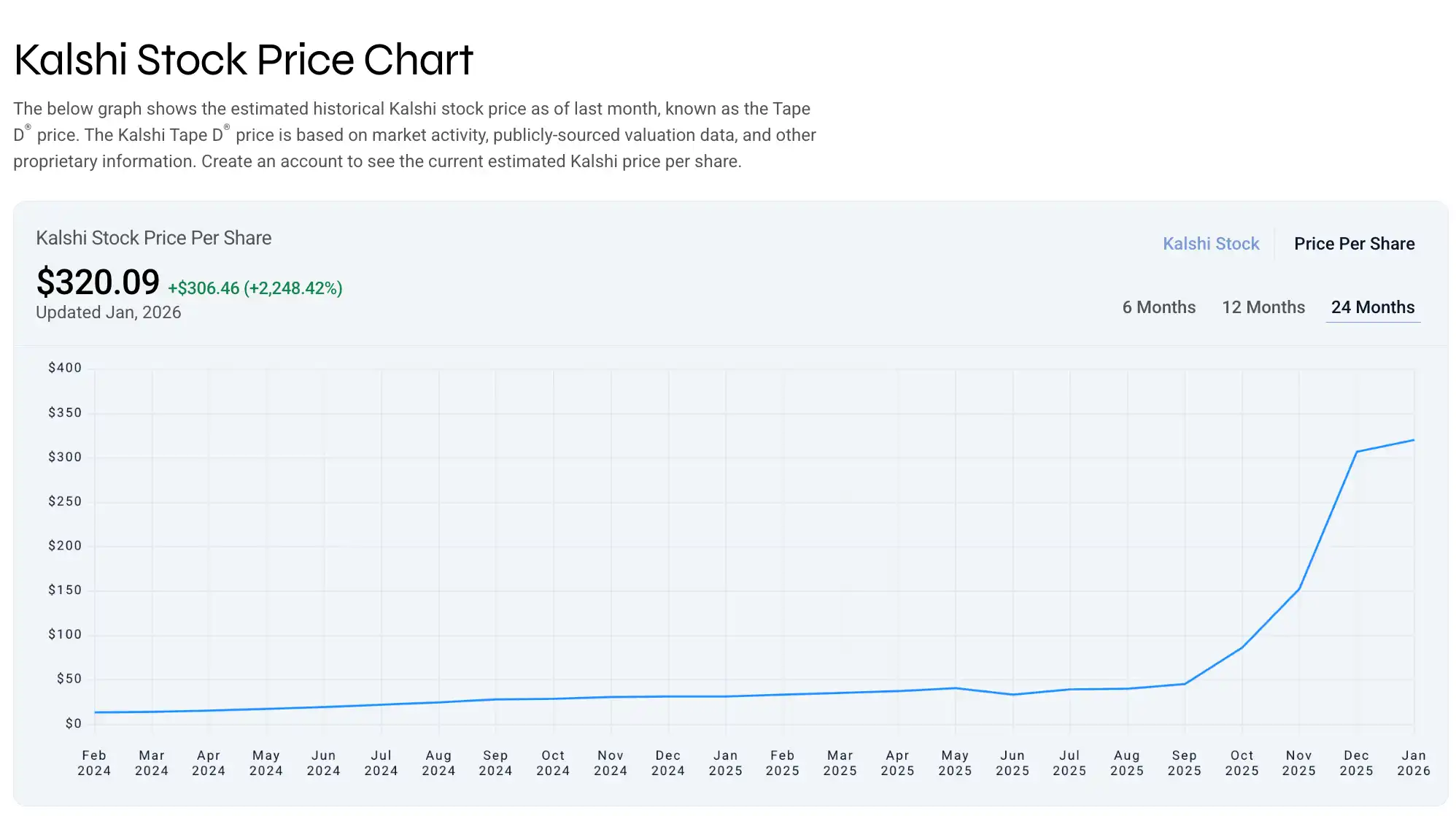 大盘下跌期,预测市场成了加密市场最亮眼的赛道。2 月初市场暴跌期间,BTC、ETH 一度跌幅超 10%,但预测市场交易依旧活跃,周交易笔数一度达 2639 万次,创历史新高。与此同时,作为美国最大的合规预测市场平台,Kalshi 在今年 1 月也以超 95 亿美元的交易量跃居赛道第一,创下单月成交量历史新高。随之而来的,则是市场对 Kalshi 盘前股价的新一轮定价。