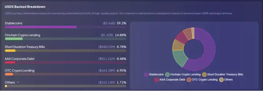 虽然 USDS 迈出了资产多元化的步伐,但储备中稳定币(USDC)的占比近六成,远高于超额抵押的部分(20%)。