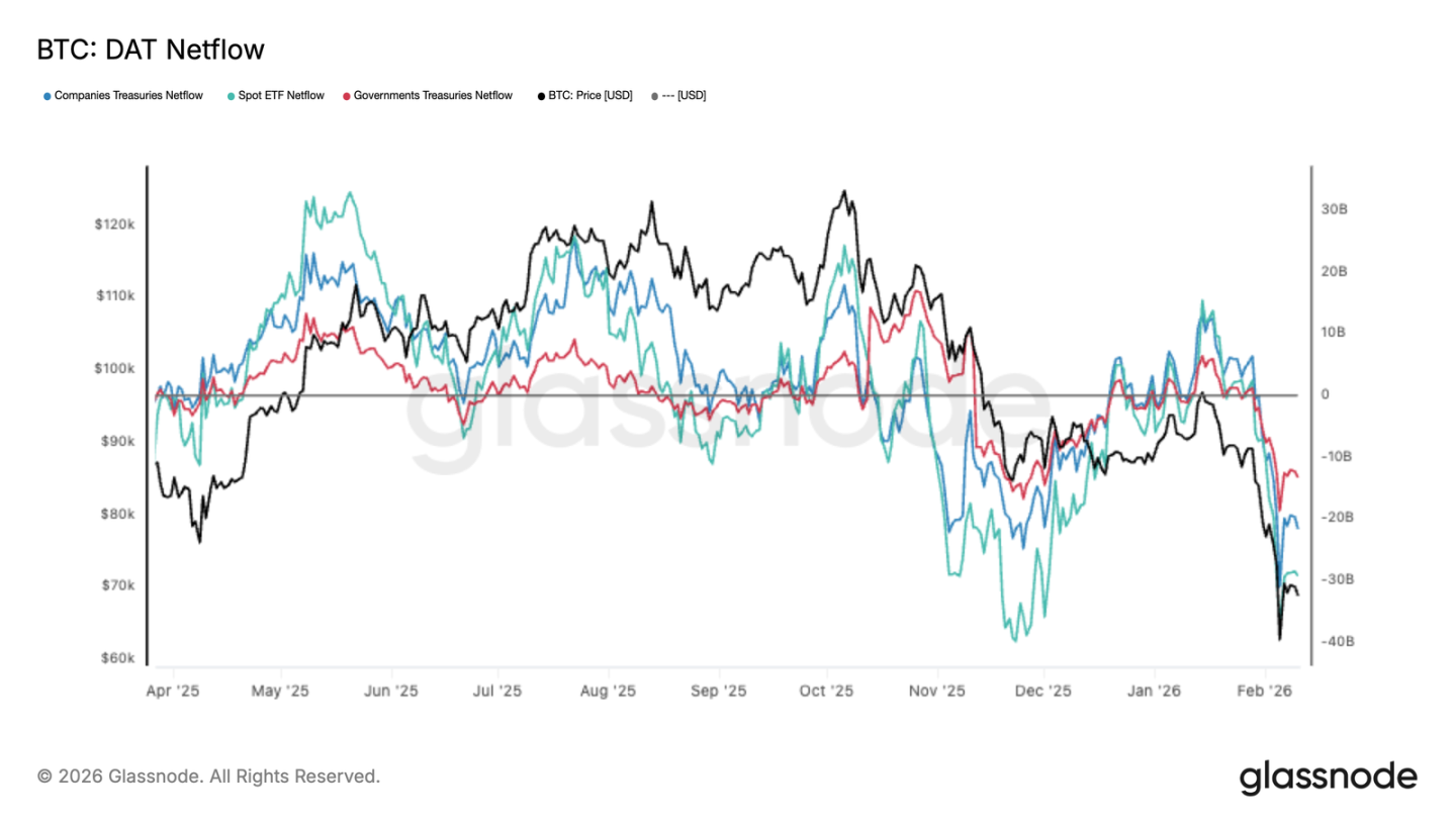 数字资产资金流最近转负得非常明显,ETF、企业、政府几类机构同时在净流出,比特币也打到了新低。ETF 是主力,企业和政府也在减,这不是某一家在调仓,是整个市场的机构都在收缩。