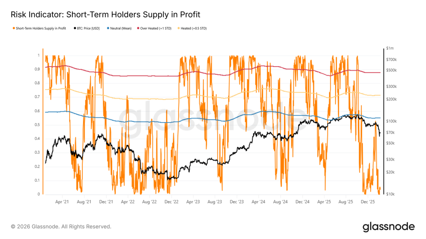 短期持有者盈利比例这个指标很适合看这个。历史上熊市反弹走到这个指标的「均值到 +0.5 倍标准差」区间时,经常就涨不动了。现在这个数字只有 4.9%,说明绝大多数最近进场的人还套着。盈利的人都很少,想靠他们砸盘也难,但也说明市场很弱,没有新钱进来,反弹很难走远。