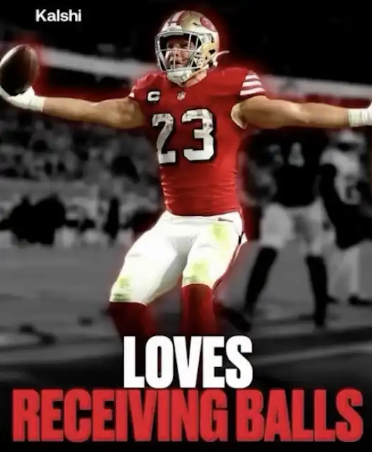 在体育领域,这种策略表现为恶搞式地模仿体育官宣卡片,也就是你常在 ESPN 或 FOX Sports 账号上看到的那种,用来宣布交易、选秀或伤病消息的图片。两家平台用博眼球的玩笑标题来「播报」体育新闻,比如 Polymarket 的「DICK IS GROWING」,影射多伦多猛龙队球员 Gradey Dick 体重增加;又比如 Kalshi 的「LOVES RECEIVING BALLS」,指的是旧金山 49 人队跑卫 Christian McCaffrey,说他「喜欢接球」,你也懂的,就是字面意义上的那种「接传球」。