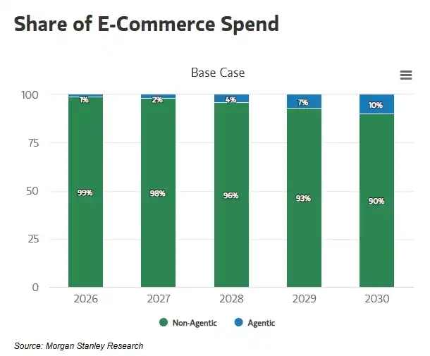 Morgan Stanley 预测:到 2030 年,Agentic Commerce 将推动美国电商支出达到 1900 亿至 3850 亿美元,对应 10%–20% 的市场渗透率。