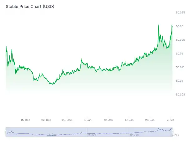 在一众稳定币基础设施中,Stable 近期的市场表现颇为引人注目。2 月 4 日主网 v1.2.0 升级前夕,其原生代币一度创历史新高,本周涨幅约 43%,最高触及 0.03 美元,当前市值约 4.2 亿美元,FDV 超 24 亿美元,明显领先多数同赛道对手。