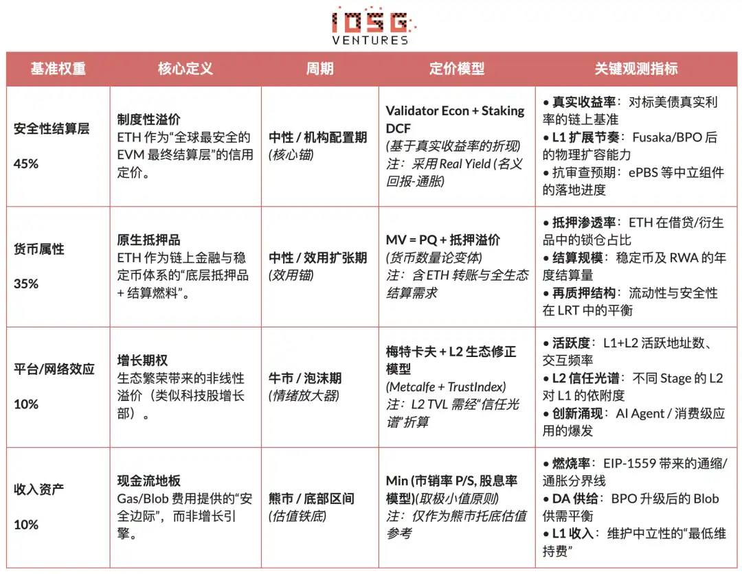· 估值框架发生结构性迁移: 安全性与机构可信度权重显著上升,手续费与平台效应权重下降,ETH 的定价正从现金流模型转向资产溢价模型。