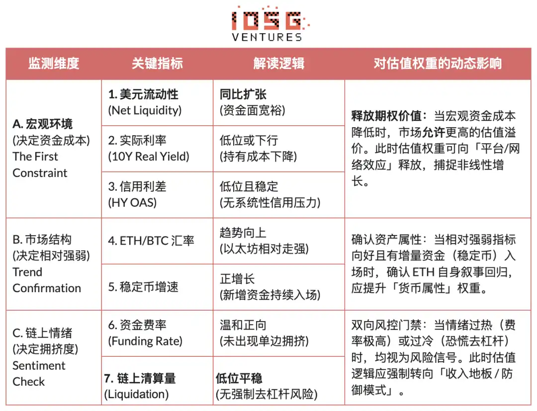如果说前文确立了以太坊的「内在价值中枢」,本章则引入一套独立于基本面的「外在环境适配系统」。估值无法真空运行,必须受制于宏观环境(资金成本)、市场结构(相对强弱)与链上情绪(拥挤度)三大外部约束。基于此,我们构建了状态适配(Regime Adaptation)机制,在不同周期动态调整估值权重——宽松期释放期权溢价,避险期退守收入地板,从而实现从静态模型到动态策略的跨越。(注:限于篇幅,本文仅展示该机制的核心逻辑框架。)