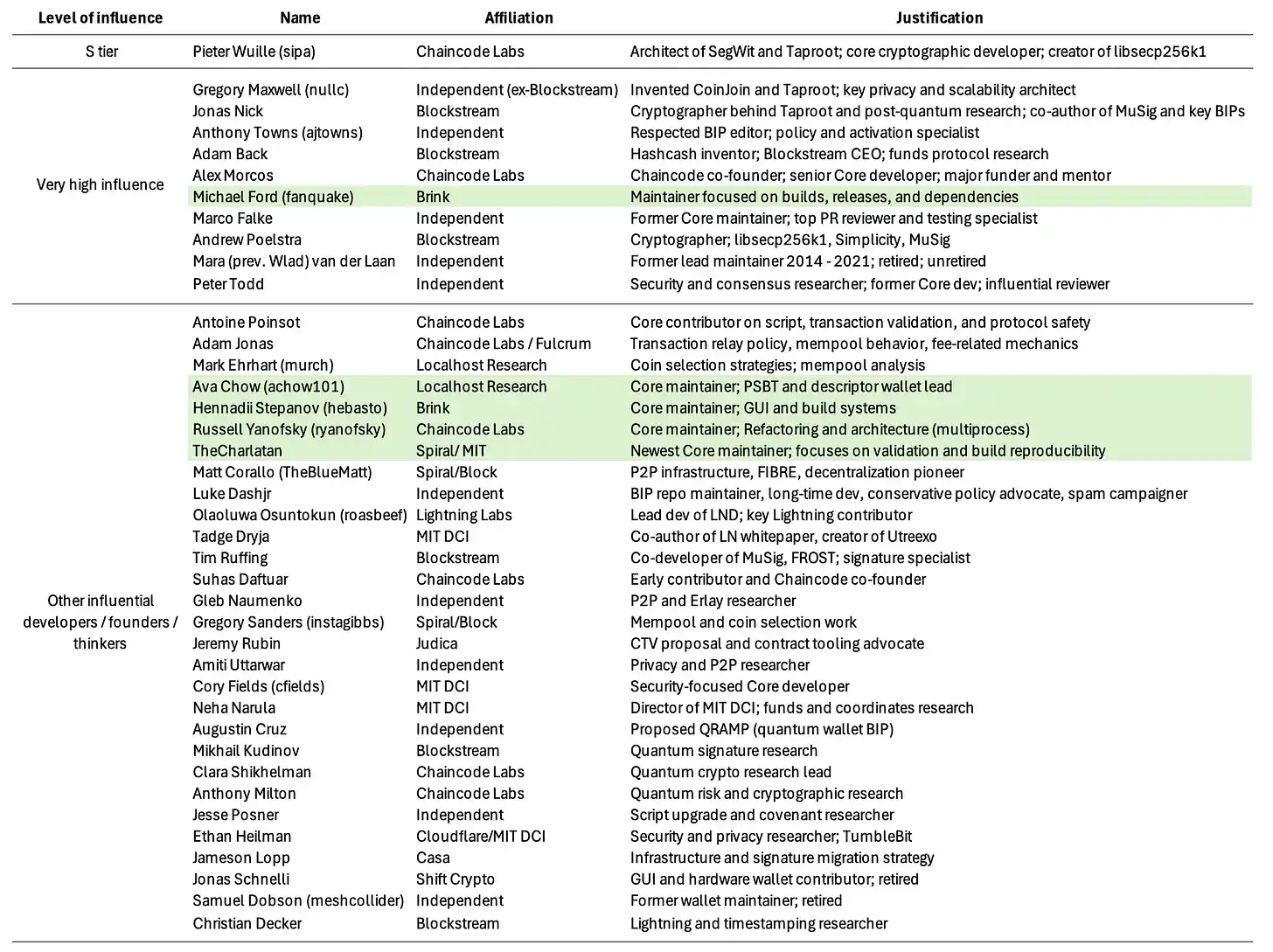 在我看来,最重要的比特币开发者/创始人包括:Pieter Wuille(毫无疑问排在第一位)、Greg Maxwell、Jonas Nick、Anthony Towns、Adam Back、Alex Morcos、Marco Falke、Andrew Poelstra、Mara van der Laan,以及 Peter Todd。其所属机构已在表中列出。