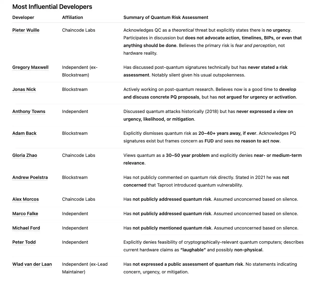 总体而言,大多数最具影响力的比特币开发者甚至从未正面承认过量子风险。少数承认风险的人(Jonas Nick 除外)也普遍认为它是理论性的、遥远的、或不可操作的。Peter Todd 与 Adam Back 明确否认风险。Pieter Wuille 承认问题存在、参与讨论,但明确表示这不是当前的风险或优先事项。