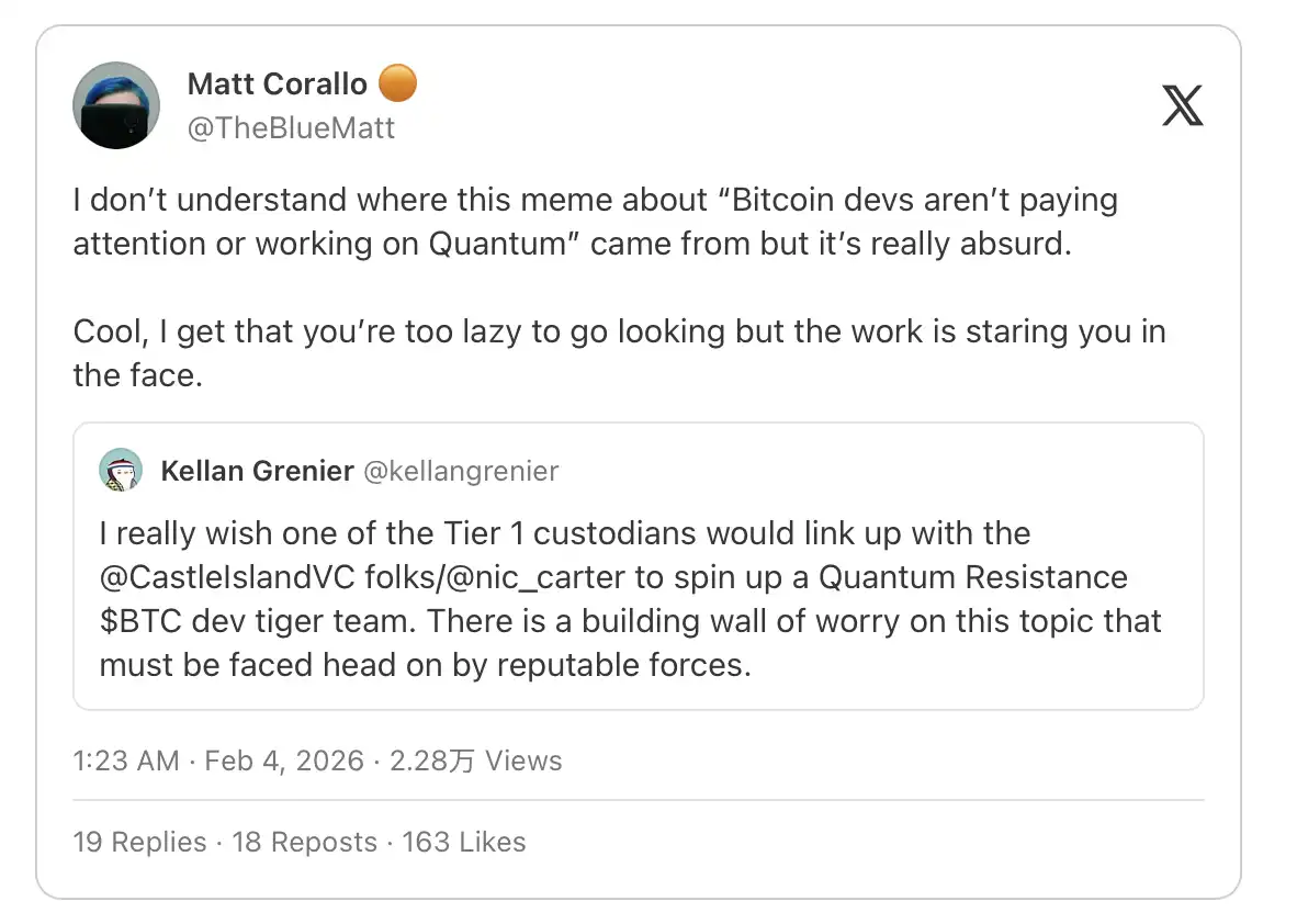 Matt Corallo 确实在乎,也确实认为存在风险。但他明确否认我「最重要的开发者不在乎」的观点,并把我的批评称为「FUD」。也许 Matt 掌握一些我没有的内部信息:也许私下里,开发者们正因量子问题而焦虑不安。但在公开场合,他们的表现却像是完全不存在任何风险。