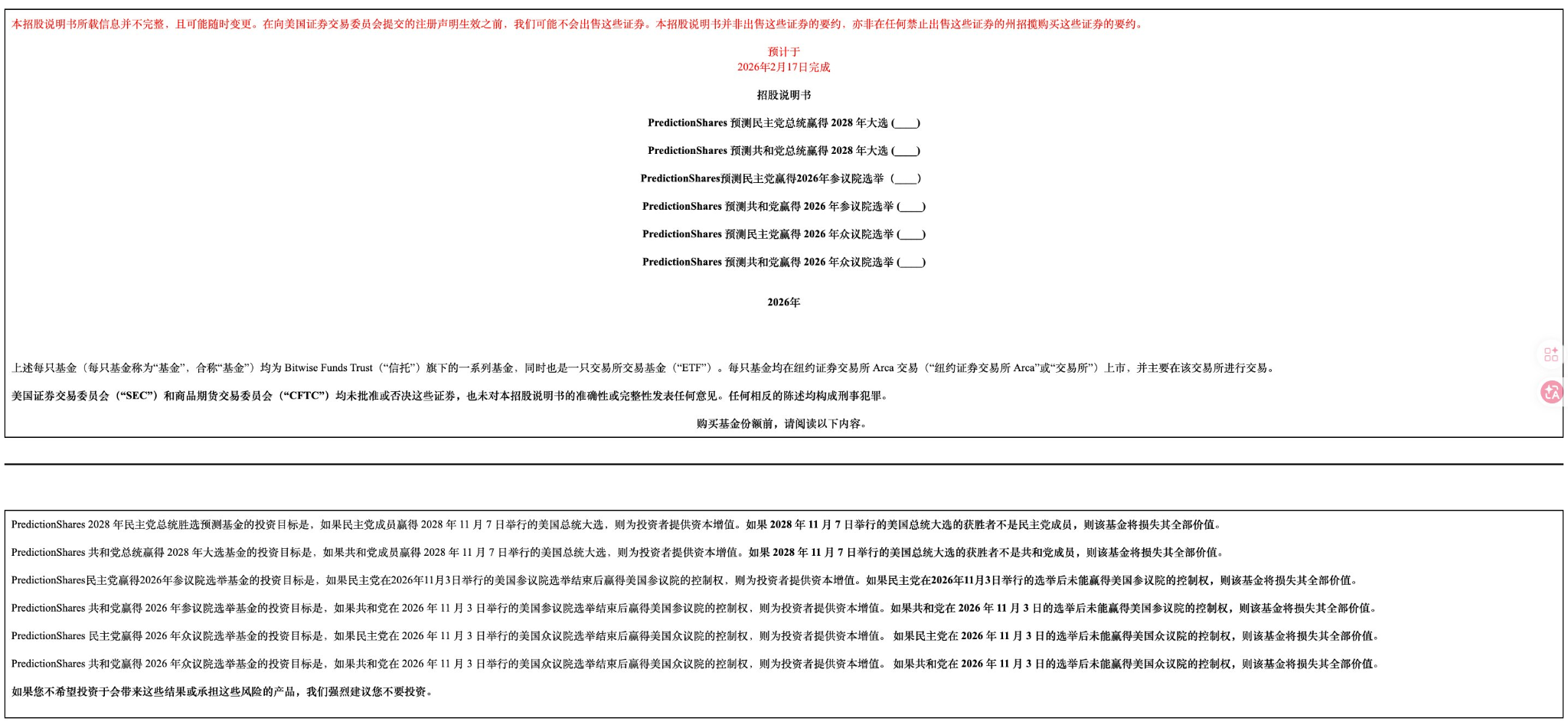 以 Bitwise 提交的六只 ETF 为例,四只直指 2028 年总统大选(民主党/共和党谁赢),剩下两只对应 2026 中期选举的参众两院控制权。GraniteShares 和 Roundhill 的结构也大差不差。简单说,这些 ETF 就是把 Kalshi 或 Polymarket 上那些二元事件合约的价格表现,直接映射成可交易的 ETF 份额。