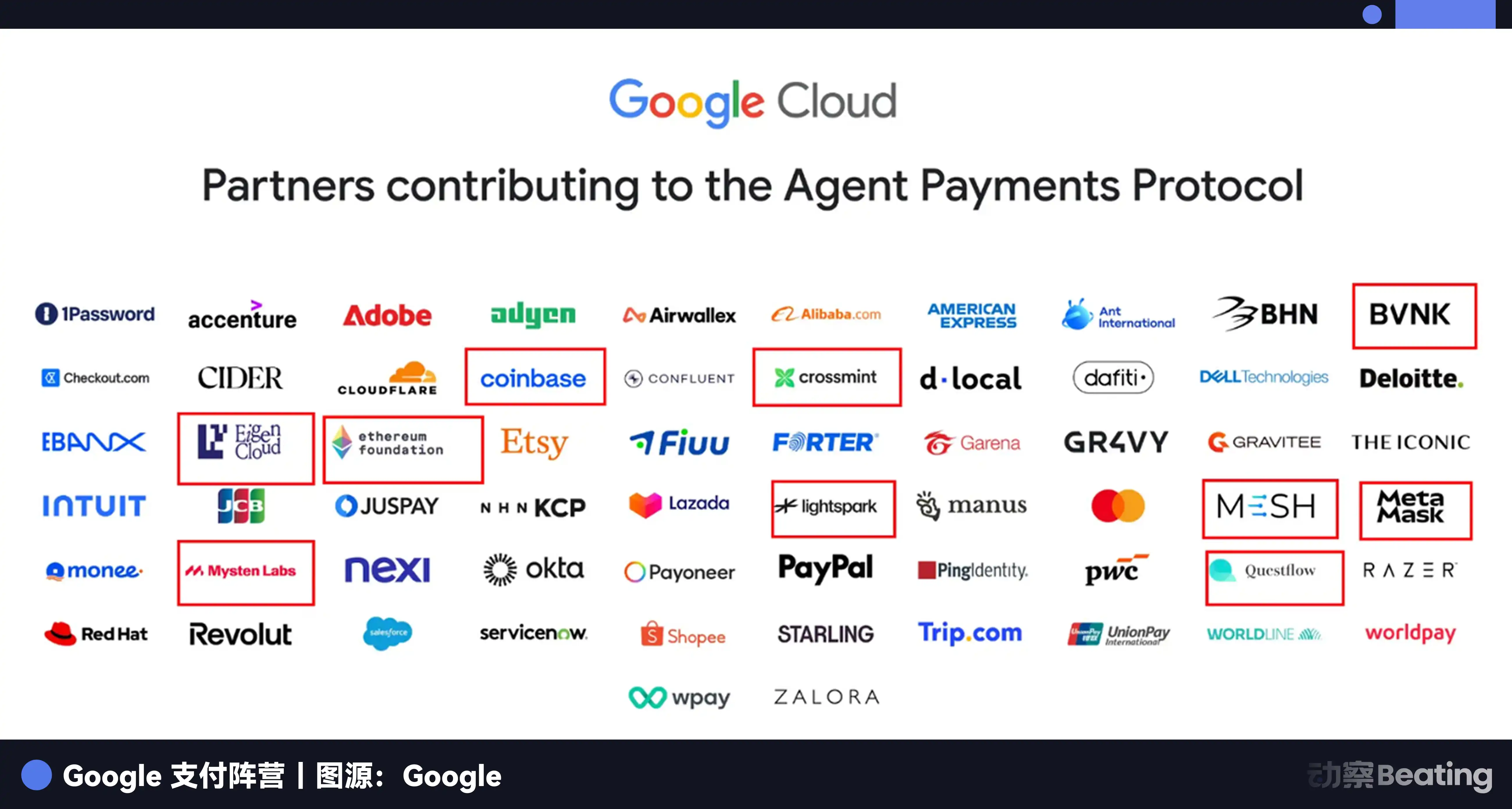 名单上全是传统金融的老面孔:Mastercard、PayPal、American Express,再加几个科技圈的盟友。