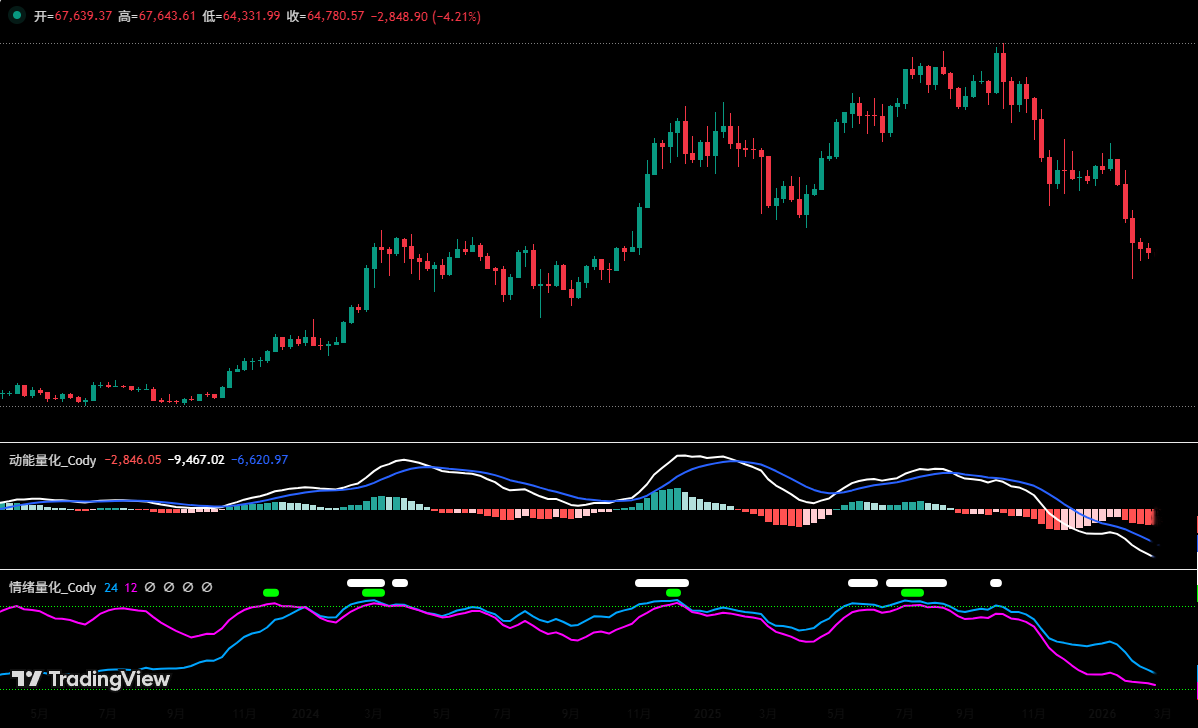 比特币周 K 线图:(动能量化模型+情绪量化模型)