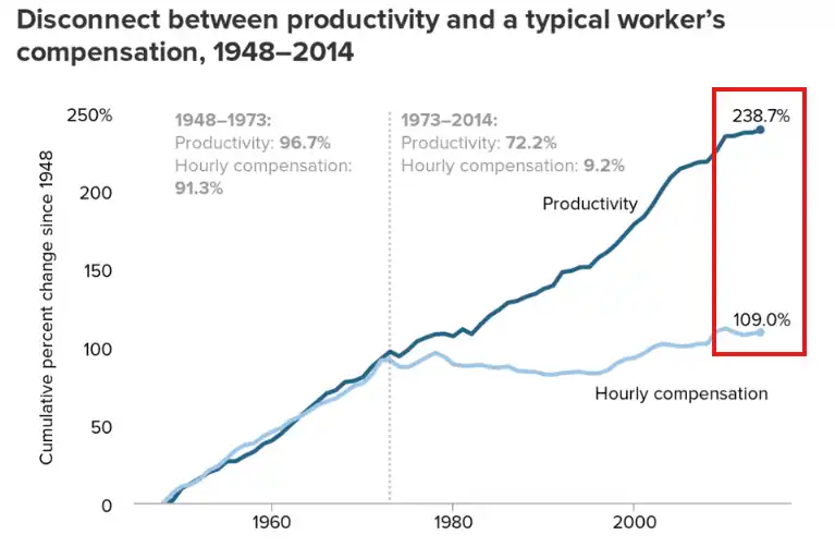 这或许可以解释为什么在过去的 70 多年里,生产力的表现一直优于工资增长: