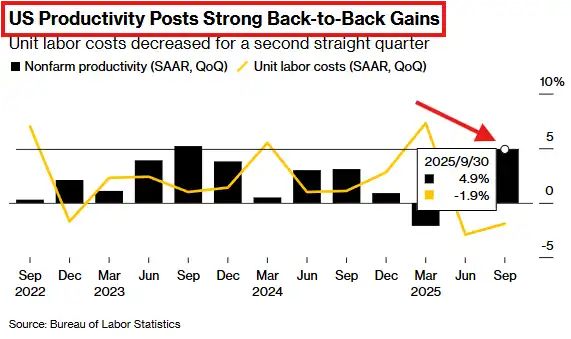 如下图所示,受 AI 影响,生产力已经开始快速增长。2025 年第三季度美国劳动生产率加速增长,创下两年来最强劲增速: