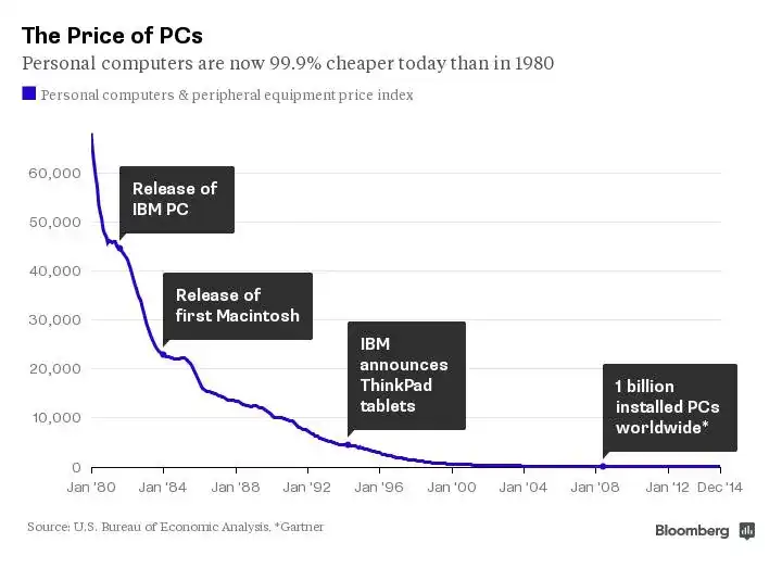 如下图所示,如今个人电脑的价格比 1980 年便宜了 99.9%。