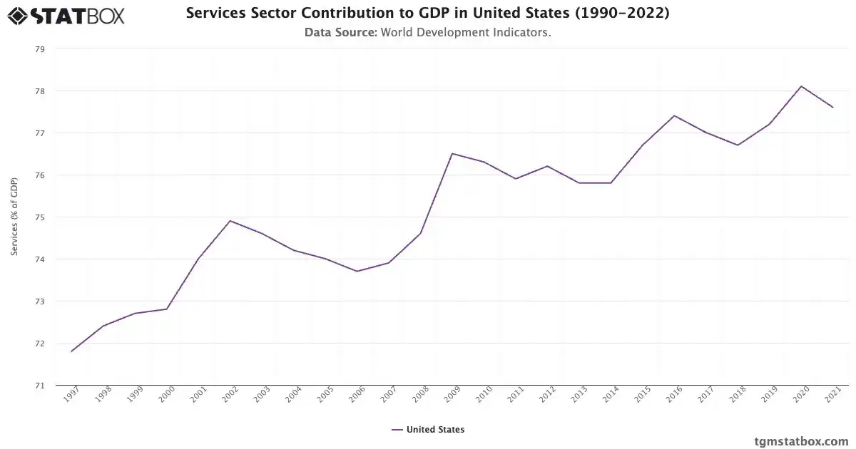 事实上,如下图所示,美国服务业贡献了近 80% 的美国 GDP。