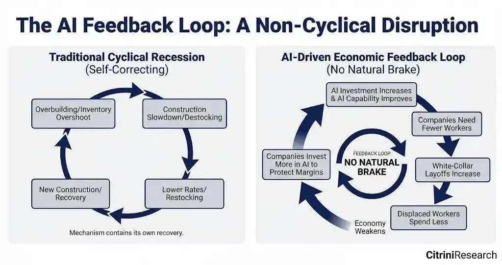 随后,负反馈开始自我强化,AI 能力提升→企业所需员工减少→白领裁员扩大→被替代者压缩支出→利润压力迫使企业进一步加码 AI 投入→AI 能力继续提升……
