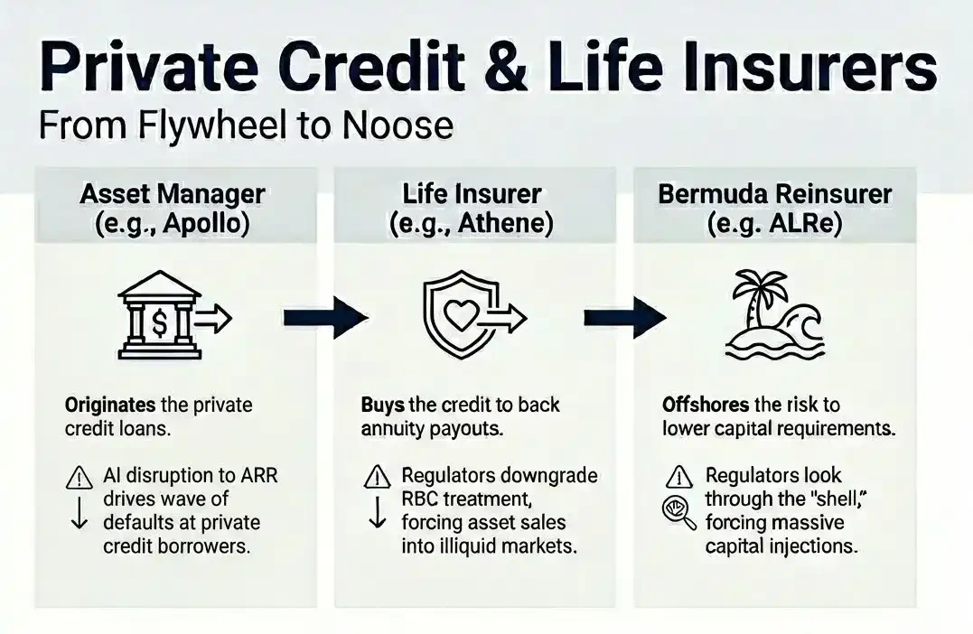 复杂性并未止步于此。这些机构不仅打造了保险永动机,还搭建了精密的离岸架构,通过监管套利提升回报。美国保险公司承保年金后,将风险再保险给其控制的百慕大或开曼子公司,这些司法辖区监管更为宽松,允许对同类资产计提更少资本。该再保险实体再通过离岸特殊目的实体引入外部资本,形成新一层交易对手,与保险公司共同投资于由同一母公司资管部门发起的私人信贷资产。