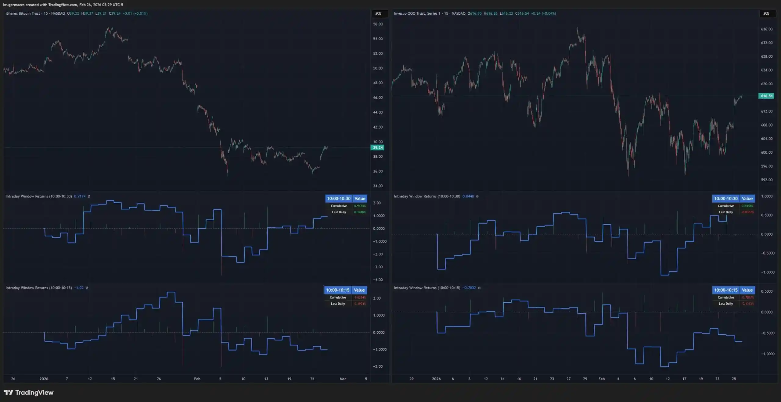 他写道,自 1 月 1 日以来,IBIT 在东部时间 10:00 至 10:30 窗口的累计回报为正 0.9%,而 10:00 至 10:15 窗口则下跌 1%。