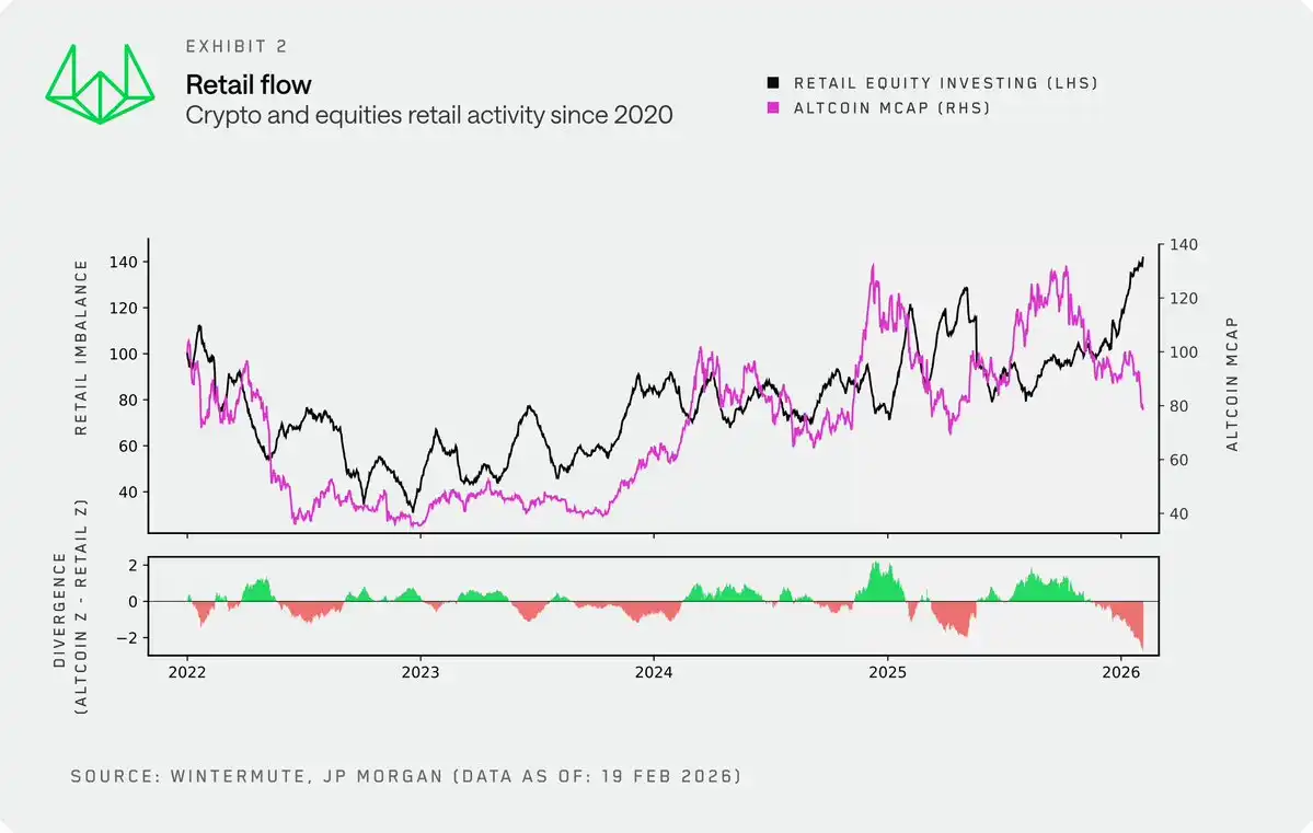 散户曾经是加密市场最可靠的条件反射式需求来源,但现在,他们的风险偏好正越来越多地在别处得到满足。美股提供了极具竞争力的波动性,赋予了散户不断增强的分析优势,而且通过手机里的同一个 App,资金就能在加密市场和美股之间实现无缝切换。加密货币在散户的投资组合中依然有一席之地,但它现在只是众多博弈工具中的一个,而不再是投机的首选载体。