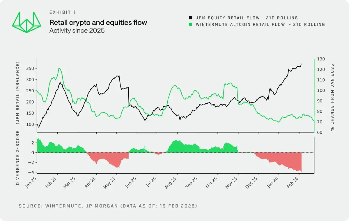 深潮导读:本文由 Wintermute OTC 交易员撰写,深度剖析了当前加密市场散户资金流失的根本原因。历史上的加密牛市往往由散户的投机推动,但最新数据表明,散户正以创纪录的速度涌入美股,导致加密市场与美股从「同涨同跌」变成了「跷跷板」。随着加密市场波动率下降、出入金门槛降低,以及 AI 赋予了散户在美股的分析优势,加密货币已不再是散户投机的首选。了解这一资金轮动逻辑,有助于我们重新调整多资产投资框架。