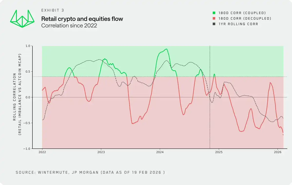 散户活跃度与山寨币市值之间的滚动相关性证实了这一转变。曾经那种虽然有波动但总体呈正相关的关系,现在已经变成了负相关。散户现在是在这两者之间做「二选一」的资金分配,而不是同时买入。
