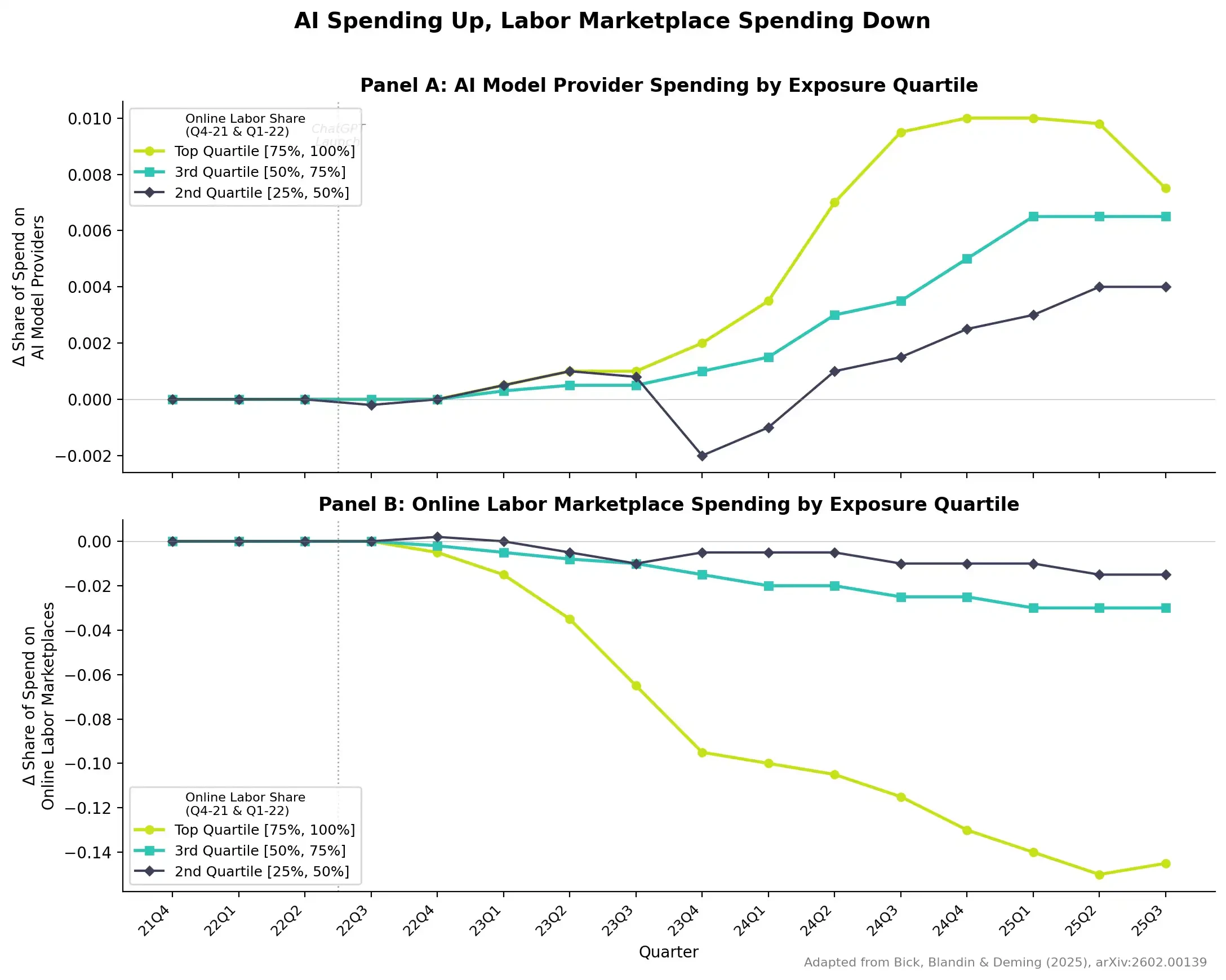 确有证据支持了 Citrini 的观点。Bick、Blandin 与 Deming 的一项基于企业支出数据的实证研究显示,在 ChatGPT 发布后,AI 暴露程度最高的企业(即此前在在线劳动力市场上支出占比最大的企业)显著增加了对 AI 模型提供商的支出,同时减少了在在线劳动力市场上的支出,降幅达到约 15%。值得注意的是,这种替代并非"等额置换"——企业每减少 1 美元的劳动力市场支出,仅增加了 0.03 至 0.30 美元的 AI 支出。换言之,AI 正在以远低于人工的成本完成同等工作量。