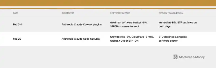 不过,有时候传导机制直接得令人惊讶。2026 年 2 月,两个和比特币毫无关系的 AI 产品发布,竟然都影响到了比特币的价格。怎么影响的?就是通过上面说的那个「机构管道」。这就是相关性在现实中的体现。