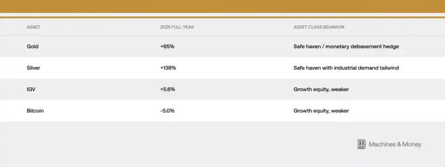 这当然不是说比特币以后永远不会成为避险资产。只是说在当前这个时间点,基于现有的投资者结构、市场状态和流动性环境,它还做不到。在 2025 年,比特币和软件股都只带来了微薄的个位数回报,而传统的硬资产却表现惊人。在这次大考中,比特币和科技成长股表现出了高度一致的行为,这是「两者正在趋同」这个观点最有力的证据之一。