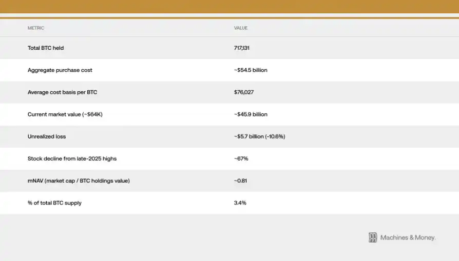 这个循环是双向的。软件板块不行了,Strategy 的股价就会跌。Strategy 股价下跌,又会加剧市场上对比特币的悲观情绪,甚至带来一些实际的卖出压力。在市场下跌的时候,这个循环会让比特币和软件指数的关系变得更紧密。Strategy 的股价从 2025 年底的高点已经跌了约 67%,比软件股 ETF 和比特币本身的跌幅都大得多。现在,这家公司的市值甚至比它手里持有的比特币的价值还低,相当于在打折交易。这说明,在比特币和软件股的相关性之上,还叠加了一层这家公司自己带来的放大效应。