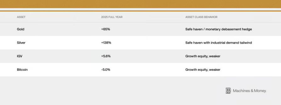 这当然不是说比特币以后永远不会成为避险资产。只是说在当前这个时间点,基于现有的投资者结构、市场状态和流动性环境,它还做不到。在 2025 年,比特币和软件股都只带来了微薄的个位数回报,而传统的硬资产却表现惊人。在这次大考中,比特币和科技成长股表现出了高度一致的行为,这是「两者正在趋同」这个观点最有力的证据之一。