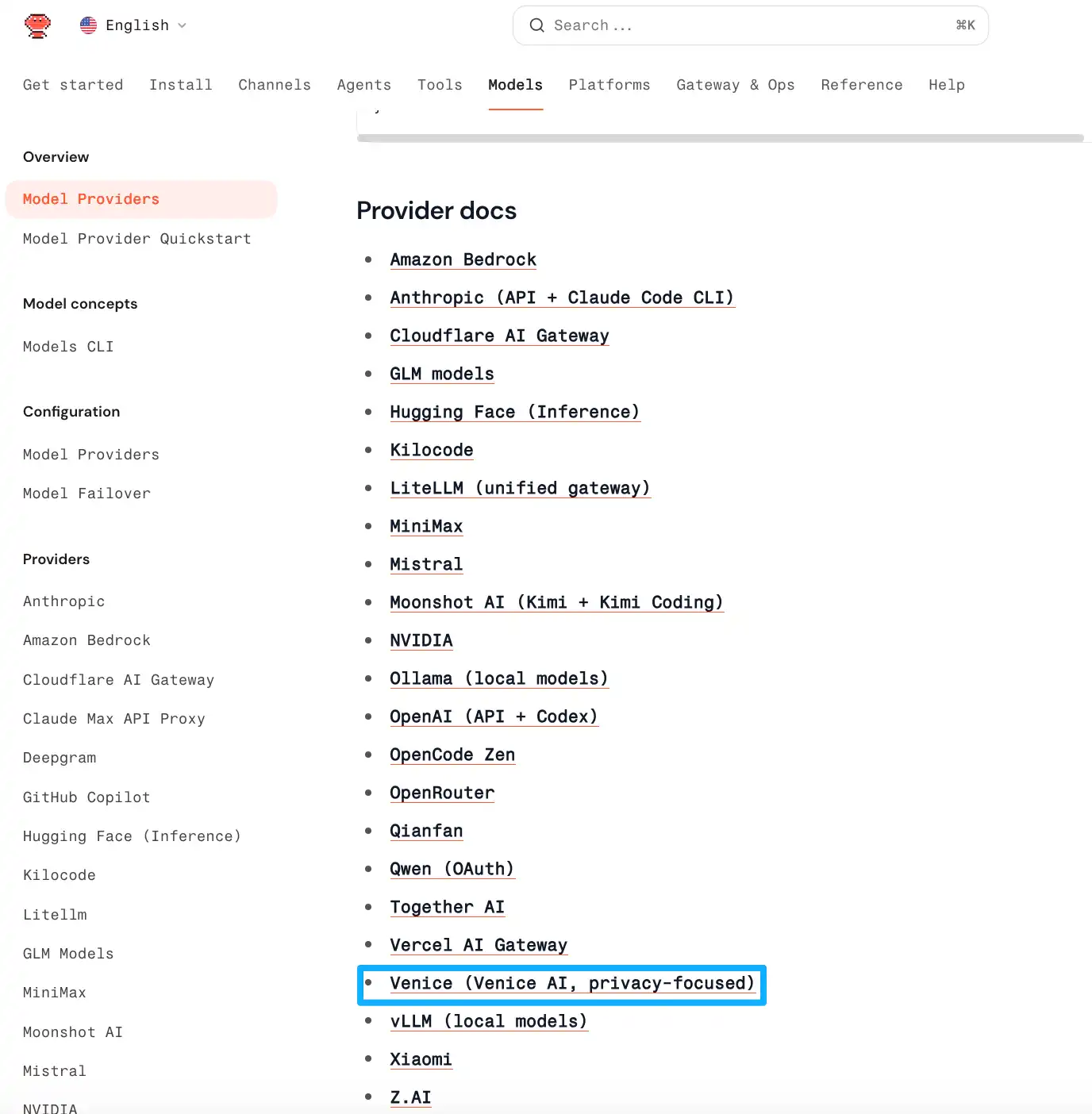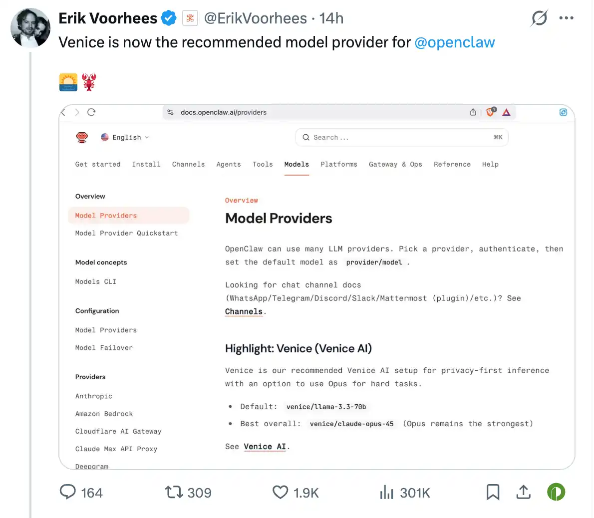 OpenClaw 当前选择的模型提供商达 22 家,其中包括 Amazon、Anthropic、Cloudflare 等大型科技公司。从体量和品牌来看,Venice 显然不是最显眼的那一个,甚至可以说是最不起眼的。但它却曾在官方文档中被高亮推荐且带有原生 Token 经济的模型提供商。不过,也有可能是文档合并误操作,目前该高亮已经移除,但它却在更早时间便已进入 OpenClaw 的模型提供商名单。