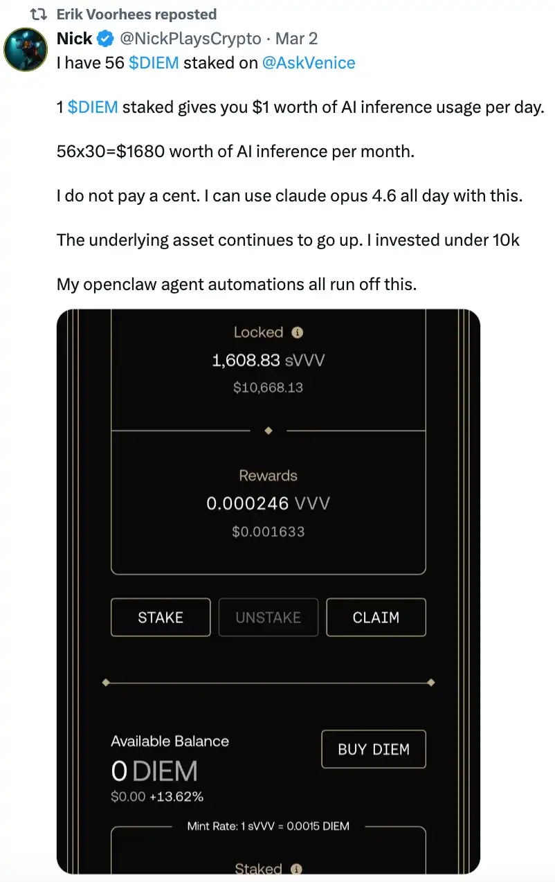 有用户已经出来现身说法,其称质押了 56 个 DIEM 可以全天使用 Claude opus 4.6 模型,本金则不到 1 万美元。
