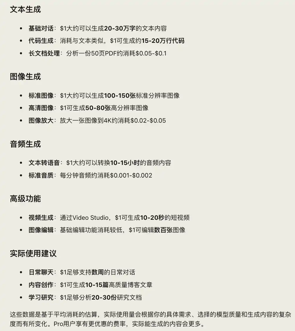 1 美元信用比较抽象,在 Venice 生态里,因为它不是固定「多少 tokens」,而是可消费 1 美元价值的推理资源。模型越贵,生成内容越少;模型越便宜,生成内容越多。这种抽象化定价,使 DIEM 成为一种「算力份额凭证」。我让 Venice 的 AI 帮我将 1 美元信用进行了量化: