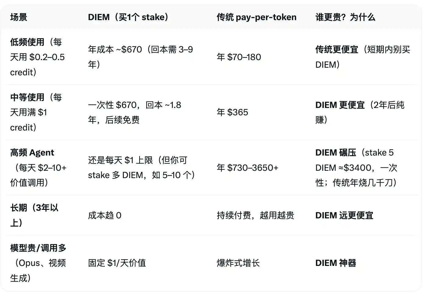 因为传统 AI API 是按需付费,对高频、长期、自动化任务(如 AI Agent 每天几百上千次调用)来说,成本会指数级爆炸,但是 Venice 通过 DIEM 把这彻底颠覆成一次性投入换取长期固定额度。当前 1 DIEM 价值约 670 美元,质押后每天自动获得价值 1 美元 API 信用,为了方便对比是购买 IDEM 更划算,还是传统按需付费更划算,我用 Grok 生成了一份粗略的表格: