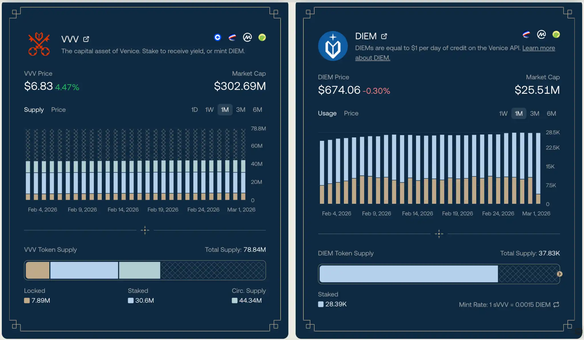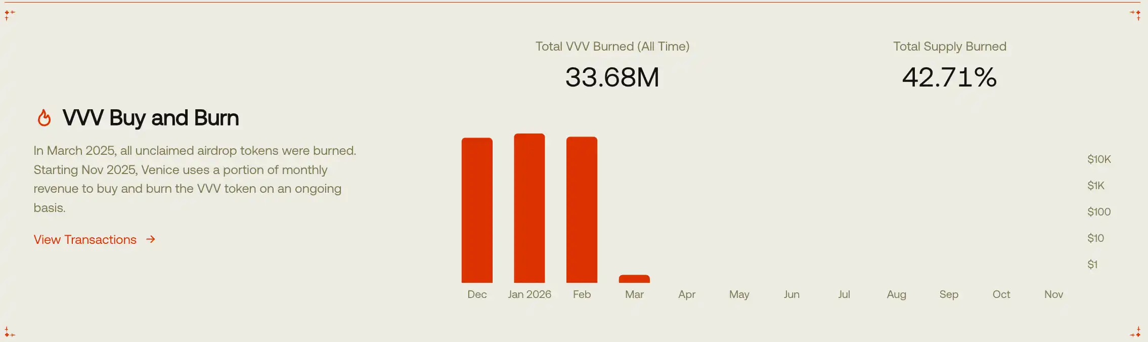 自 2025 年 10 月开始,Venice 宣布将原排放计划 1 千万枚 VVV/年削减至 800 万枚/年,同时启动了月度营收回购+销毁机制,当前月度销毁能力在 3 万~5 万枚,价值约 6 万~9 万美元。当前,42.71% 的代币供应已经被销毁。而在 2026 年 2 月初,官方再一次宣布排放削减计划,将 800 万枚 VVV/年削减至 600 万枚/年,这一系列调整,直接改变了供应预期。从代币价格表现来看,这也是 VVV 的起涨点。