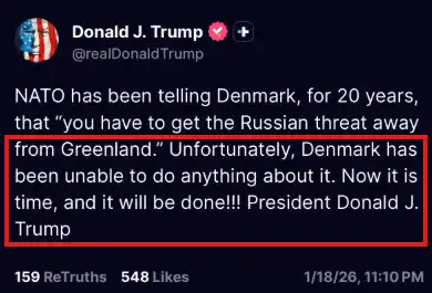 接下来,再来看下面这条特朗普总统在 Truth Social 上发布的帖子。事实上,在 1 月 1 日至 1 月 18 日之间,我们看到了特朗普发布的多条类似内容。