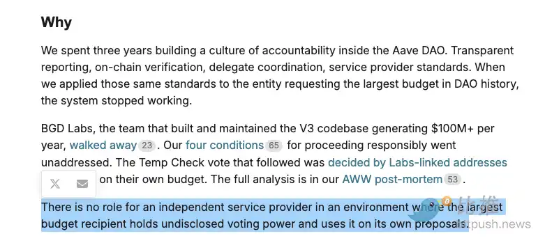 一位 DeFi 从业者评论说:「这不是谁对谁错的问题,而是当利益和立场不一致时,现有的治理机制没有提供有效的化解方式。」