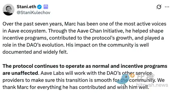 Stani Kulechov 在 ACI 宣布退出后回应:「感谢 Marc 多年来的贡献,协议将继续正常运营。」