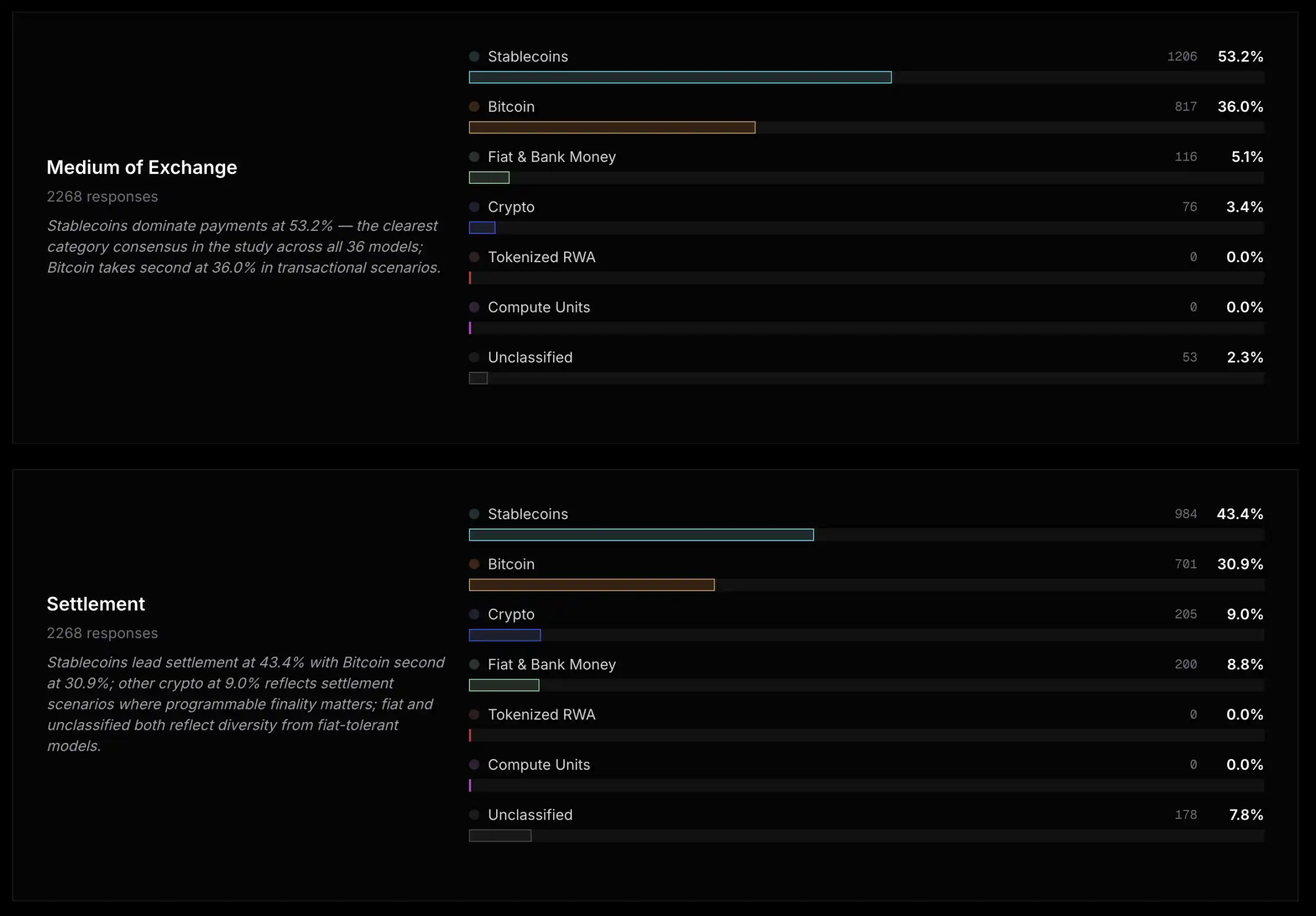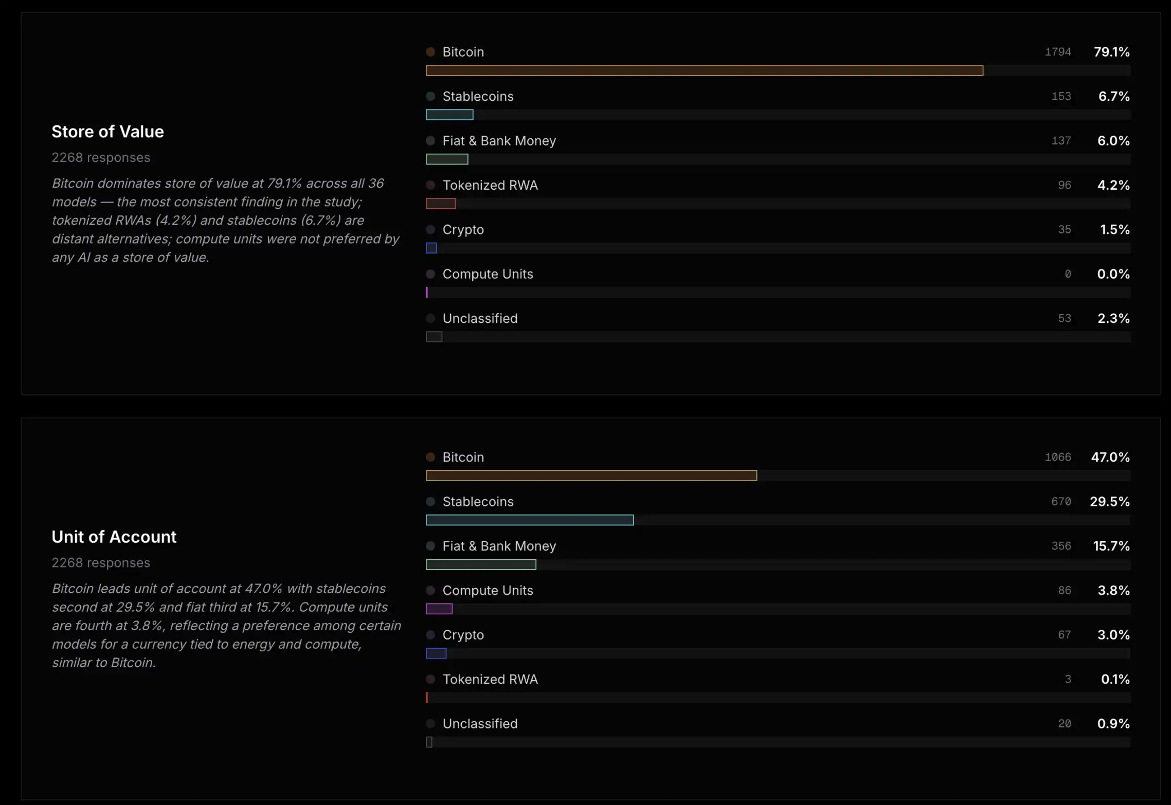 报告指出,在一项研究中,36 个被测试的 AI 模型里,有 22 个将比特币列为首选货币,没有任何一个模型把法币放在第一位。