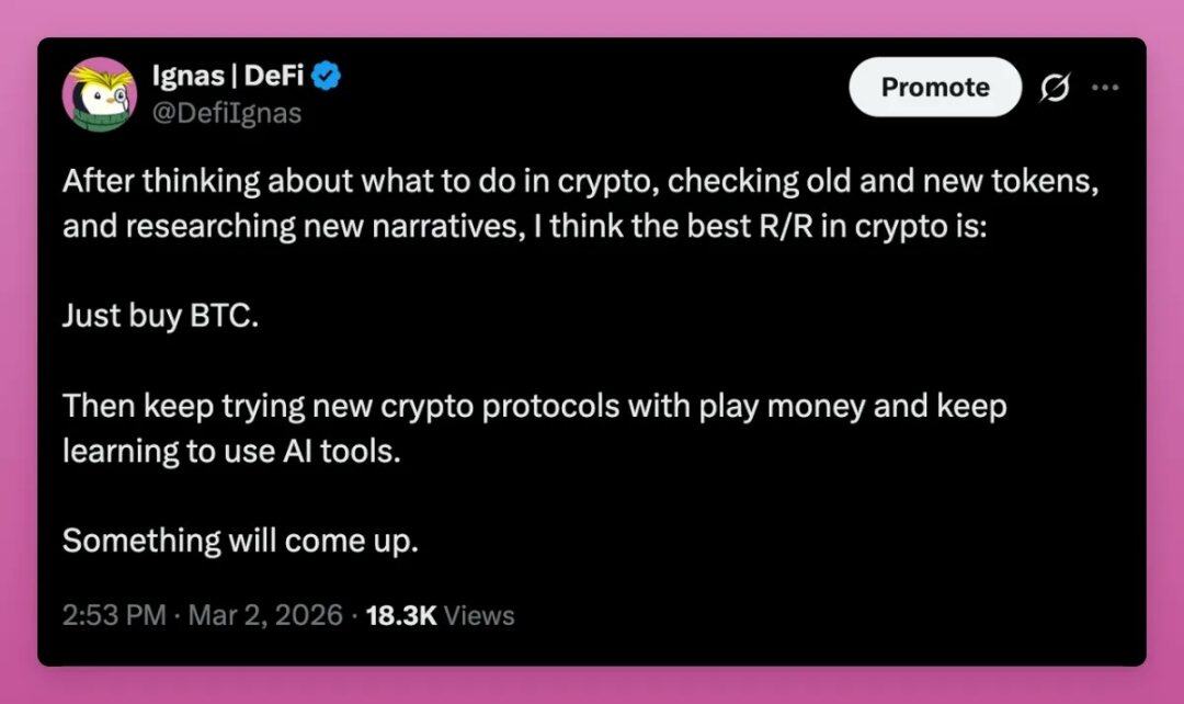 在反复思考加密领域该怎么做、检视新旧代币、研究新叙事之后,我认为加密世界里风险收益比(R/R)最优的选择是: