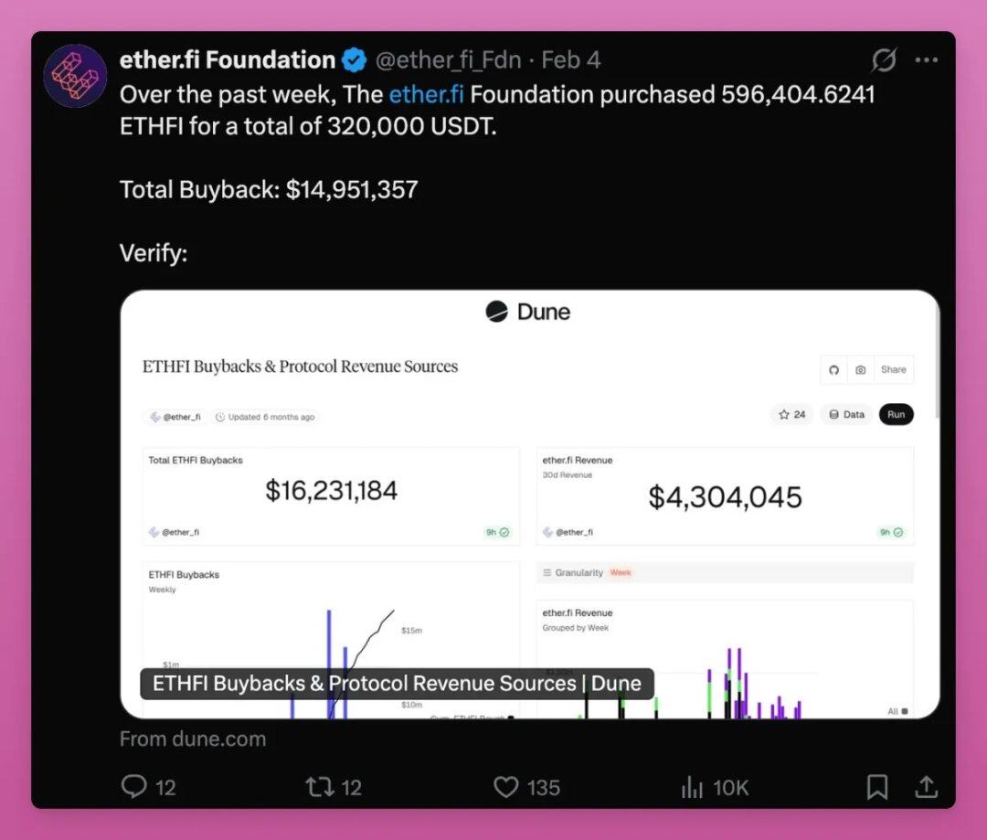 - ether.fi 每月通过回购分给持有者 150 万美元。