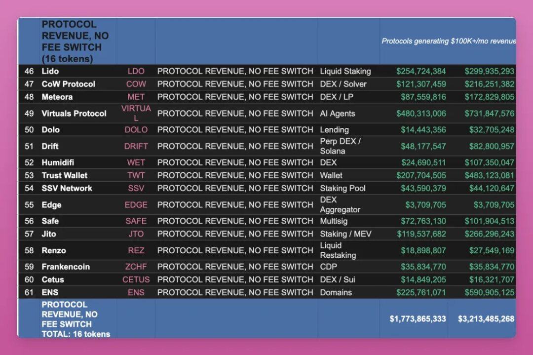 这类共 16 个代币,每月协议收入 ≥ 10 万美元,收入留在财库。