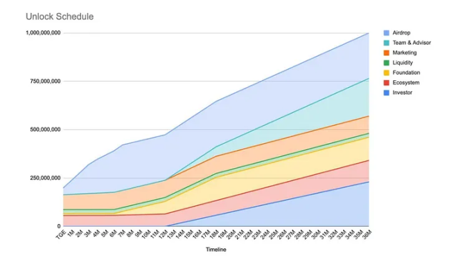 与此同时,项目内部持仓比例也进一步加剧了社区的不满情绪。根据代币分配,投资者占比 23%,团队与顾问占比 19.5%,基金会占比 12%,三者合计超 54%。