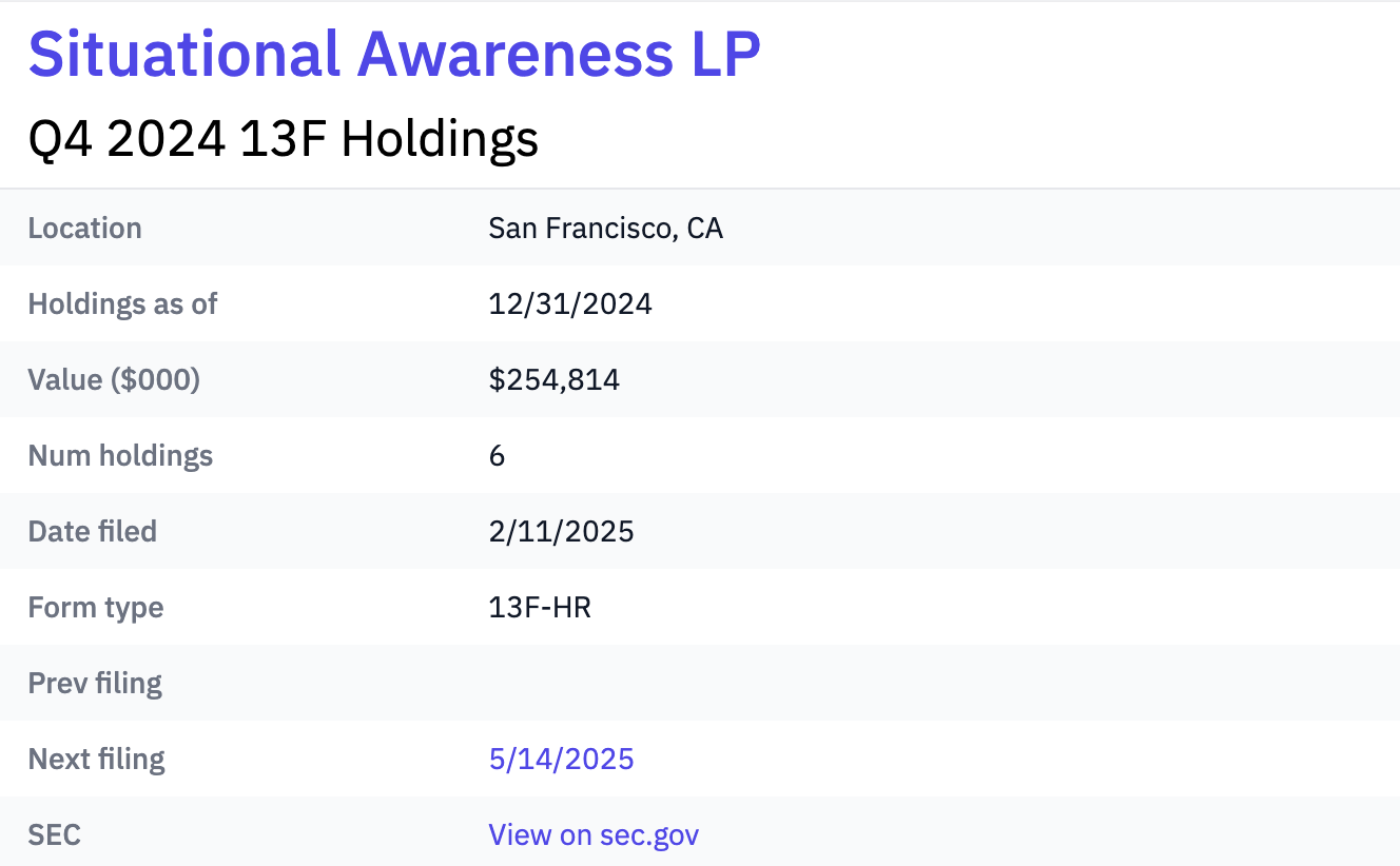 这是当下 AI 投资圈内最火的名字之一 —— 24 岁的他,所创立的 Situational Awareness LP 基金在 2024 年 Q4 的公开持仓规模还“仅”有 2.25 亿美元,而在上个月公布的 2025 年 Q4 持仓披露中,这一数字已飞速增长到了 55 亿美元。