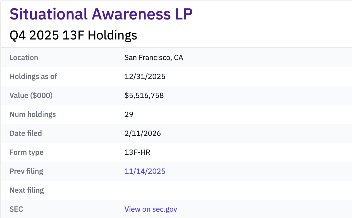 根据 Situational Awareness LP 所披露的 13F 文件(SEC 对资管规模超 1 亿美元的基金所要求的季度披露文件),2024 年 Q4 之时,Situational Awareness LP 的公开持仓总价值还“仅”有 2.55 亿美元,而在今年 2 月 16 日刚公布的 2025 年 Q4 持仓披露中,该数字已增长到了夸张的 55 亿美元。