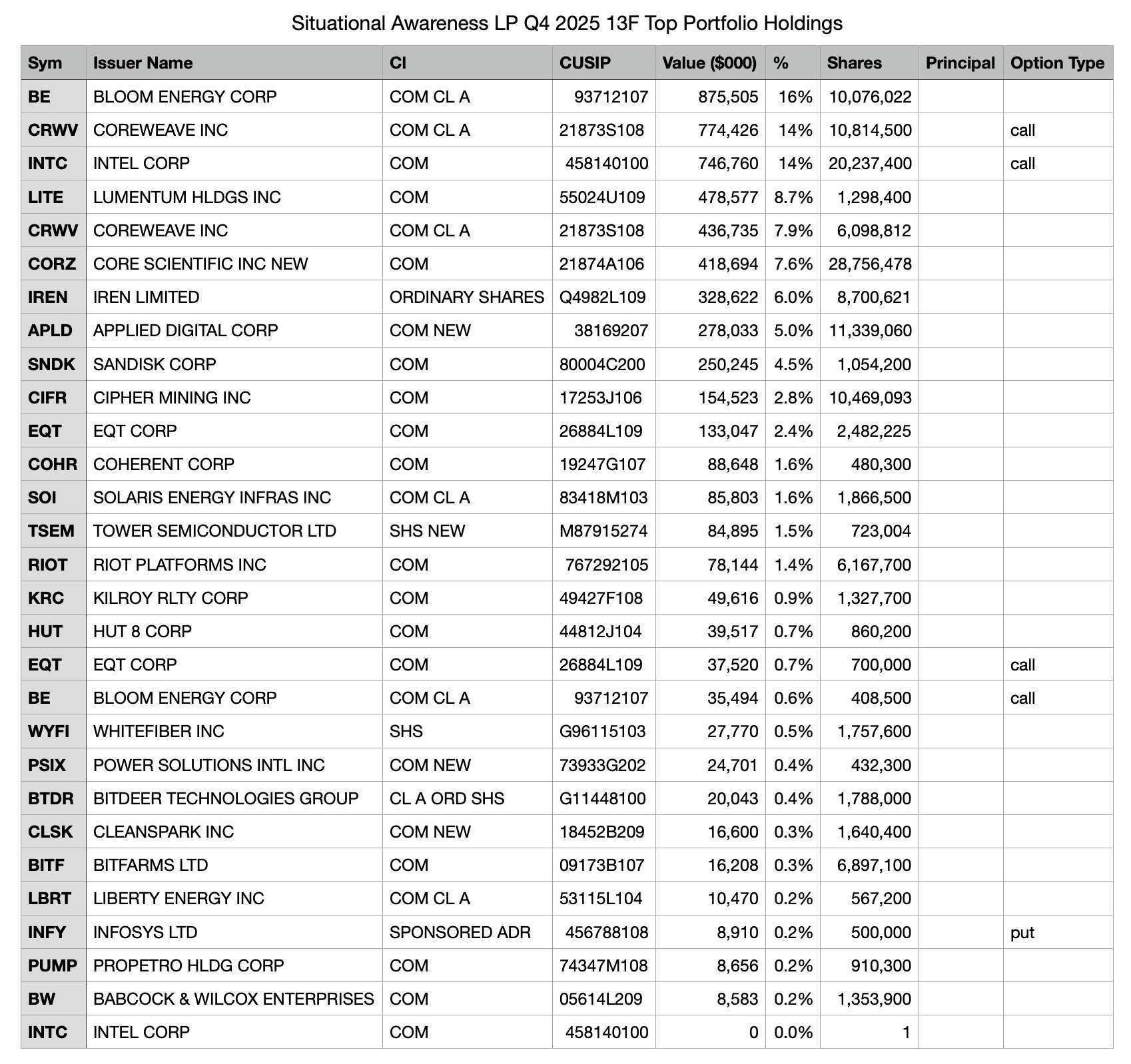 另一个与加密世界多少有些关联的线索在于,Situational Awareness LP 的持仓中可以看到多家比特币矿企的影子,比如 Core Scientific、Cipher Mining、Iren(原名 Iris Energy),以及吴忌寒旗下的比特小鹿(Bitdeer)。