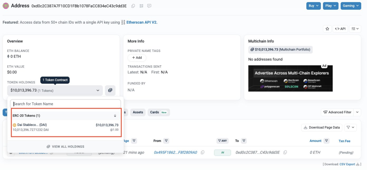 据 PeckShield 监测,目前约 2000 万枚 DAI 位于 2 个攻击者控制的钱包中(尚未混币):0xdCA9 开头地址(约 1000 万美元)和 0xd0c2 开头地址(约 1000 万美元)。目前攻击者已开始向 Arbitrum 跨链少量资金。